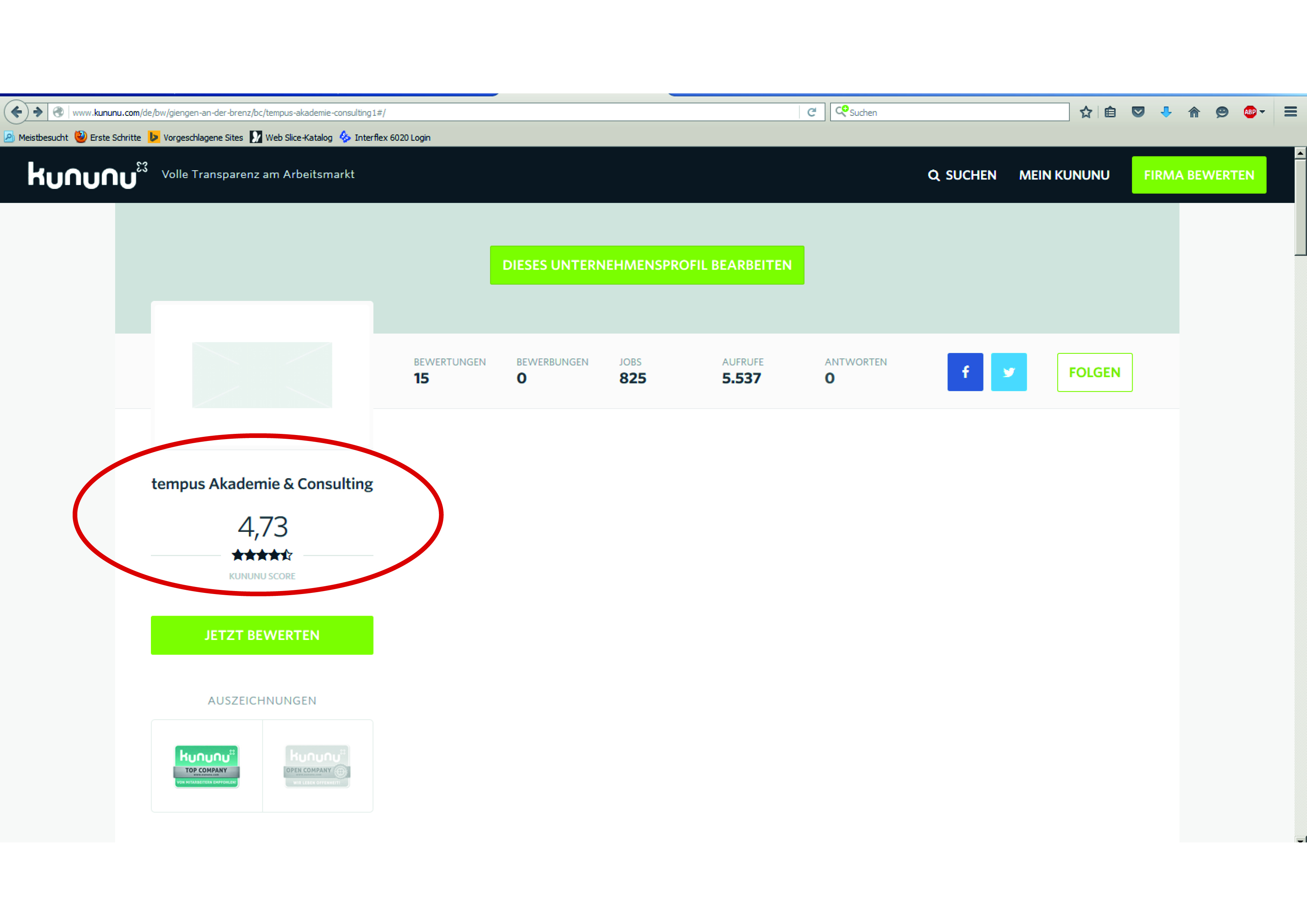 Wir haben bei kununu mittlerweile 15 Bewertungen mit einer Durchschnittsnote von 4,73 (1,0 = mangelhaft, 5,0 = spitze). Bei unserer Recherche zum Buch „Das Geheimnis der Champions“, das letzten Monat auf den Markt kam, haben wir über 1.000 Firmen recherchiert. Die Bewertung bei kununu ist dabei ein ganz wichtiger Faktor. Ist ein Unternehmen besser als 4,3 (also z. B. 4,4 oder 4,5), dann haben wir es bereits in die engere Wahl der Champions genommen. Insofern ist 4,73 ein wirklicher Spitzenwert.